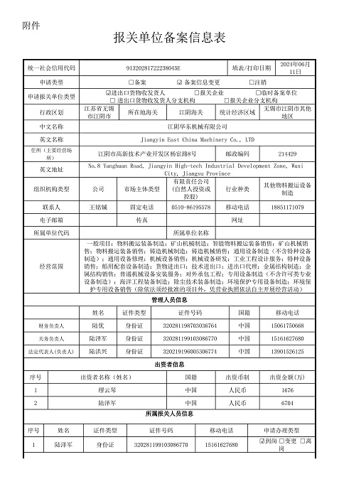 имеет право на самостоятельное осуществление экспортно-импортных операций Номер регистрационной анкеты участника внешнеторговой деятельности : 3216966118 Името на компания за износ : Jiangyin East China Machinery Co., Ltd. Лиценз Фото :